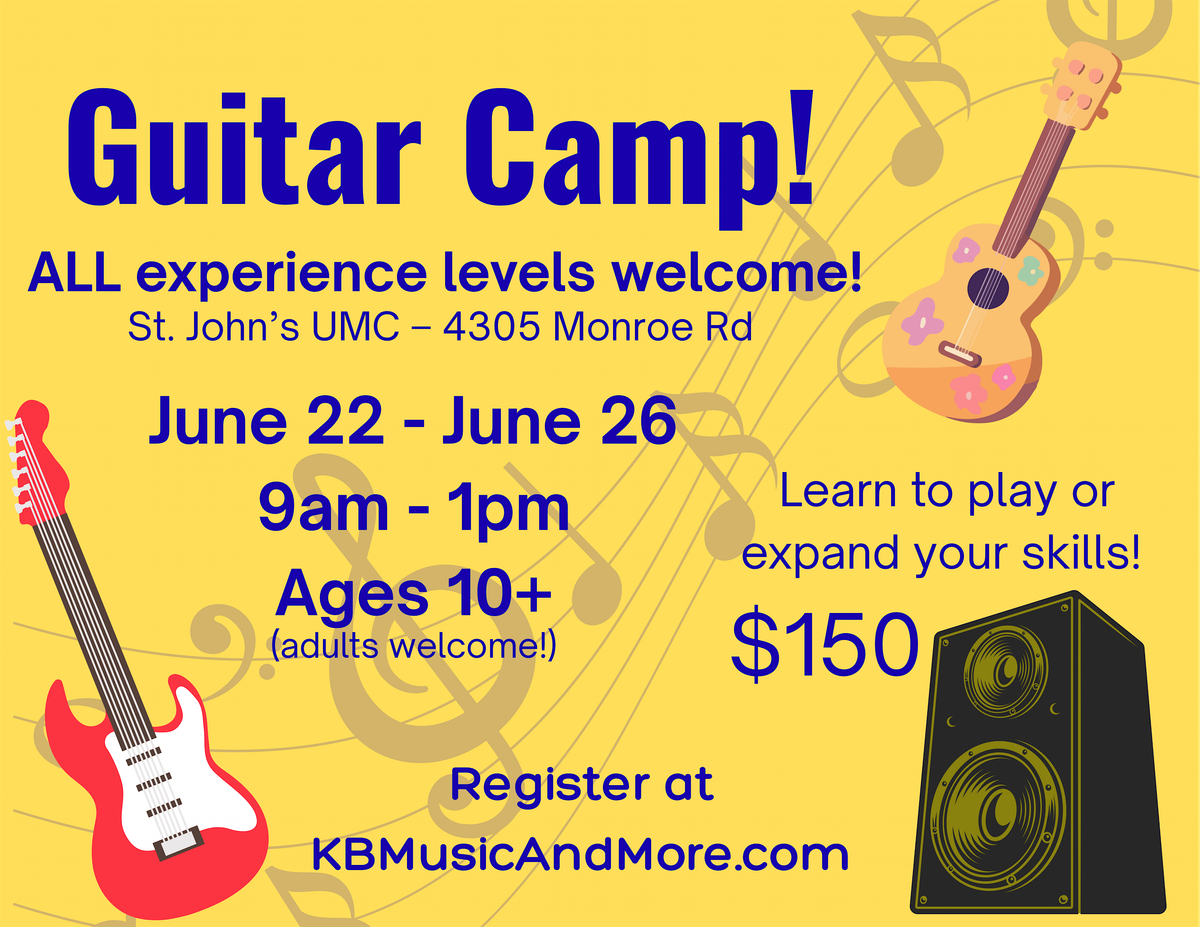 Play guitar? Want to learn to play? Join us for a Summer camp for youth AND adults to grow your guitar skills and prepare a concert together