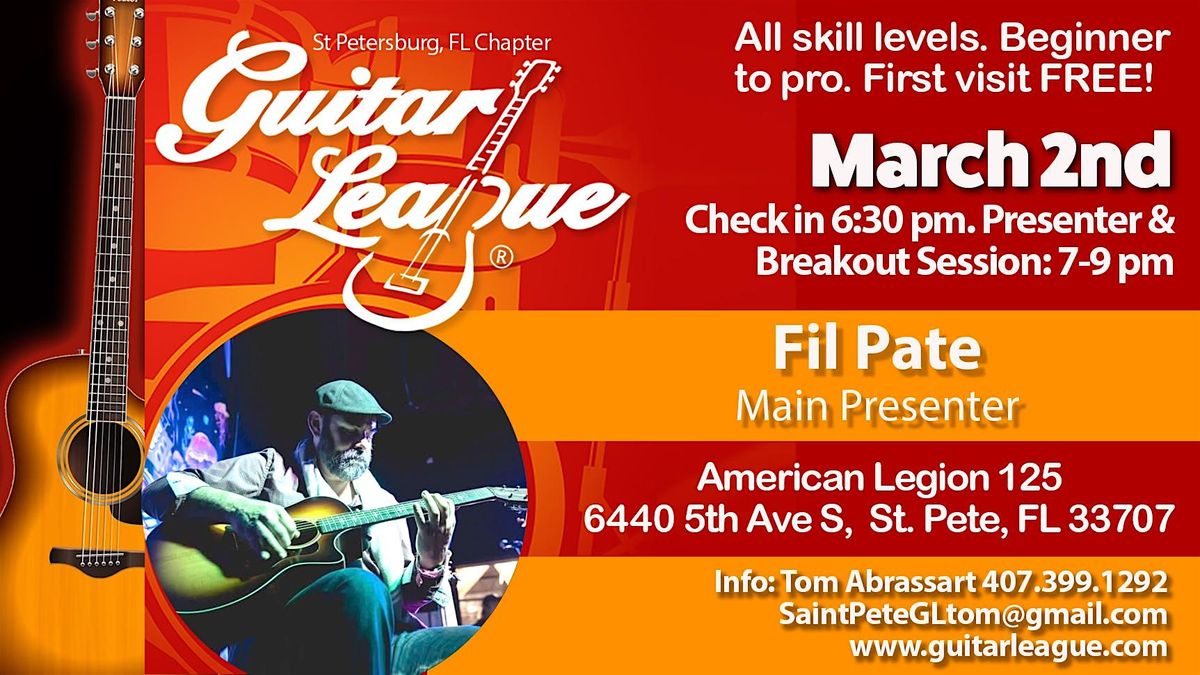 Guitar League Saint Petersburg will meet on Monday night March 2nd, 2026 at the Gulfport American Legion 125 – sign in at 6:30pm. Tampa area musician Fil Pate will be presenting for the second time.
