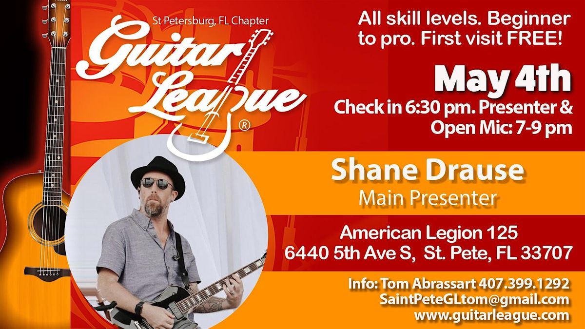 Guitar League Saint Petersburg will meet on Monday night May 4th, 2026 at the Gulfport American Legion 125 – sign in at 6:30pm. We are pleased to welcome Shane Drause as our main presenter!