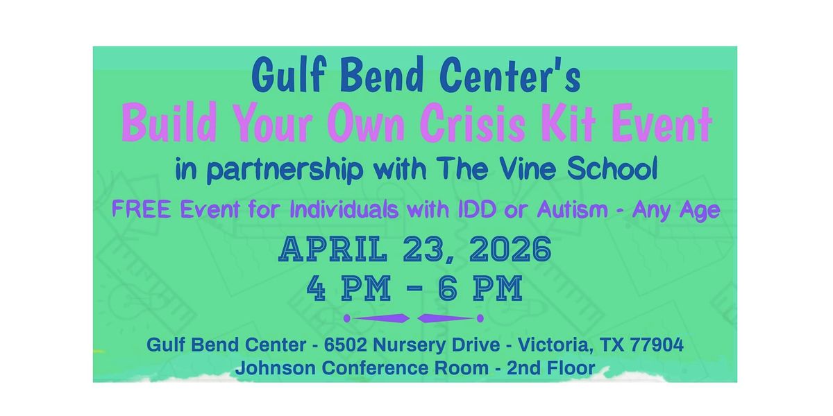 Gulf Bend Center is excited to host the “Build Your Own Crisis Kit” event in partnership with The Vine School. This free event is open to individuals with intellectual and developmental disabilities (IDD) and/or Autism of any age. Only the individual with IDD/Autism needs to be registered.