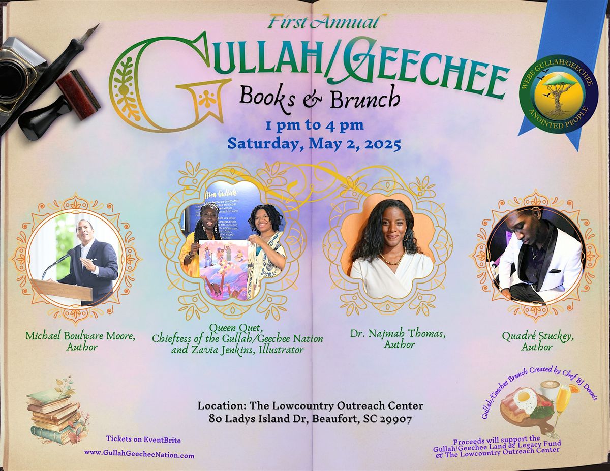 Join us for the first annual "Gullah/Geechee Books & Brunch" at the Lowcountry Outreach Center on Lady's Island, SC. The event will feature , author and great great grandson of Gullah Statesman, Robert Smalls, Michael Boulware Moore, professor and Gullah/Geechee legacy farmer, Dr. Najmah Thomas, Gullah/Geechee artist, Zavia Jenkins and Gullah artist and author, Quadré Stuckey. They will each share from their works while engaging in a Gullah/Geechee brunch.