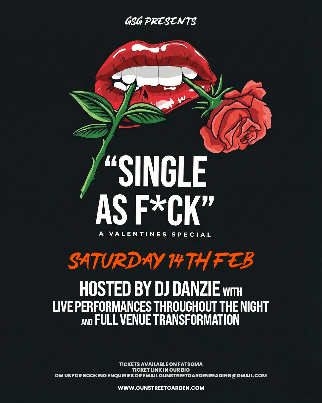 Gun Street Garden Presents - SINGLE AS F*CK (Valentines Special)Alone for Valentine’s? Do not worry. GSG is offering you a chance to escape the love hearts and poems through our SINGLE AS F*UCK Valentine’s Event. Don't delay - book your tickets now