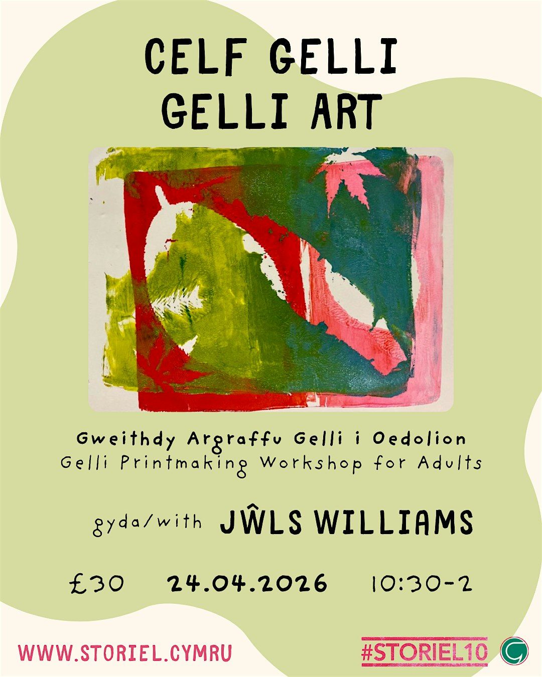 Archwiliwch gelf argraffu gyda'r artist Jwls Williams yn y gweithdy tywys 2.5 awr hwn. Dysgwch dechnegau torri lino, argraffu gelli, a mono-argraffu, a chreu eich argraffiadau unigryw eich hun i mynd adra.Mae pob deunydd wedi’i ddarparu ac ar gael. Boed chi’n ceisio argraffu am y tro cyntaf neu eisiau datblygu eich sgiliau, mae’r sesiwn hon yn ymarferol, hamddenol ac yn annog creadigrwydd.