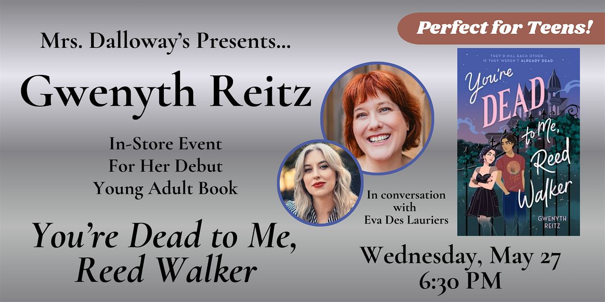 Join us at Mrs. Dalloway's Bookstore on Wednesday, May 27 when Gwenyth Reitz comes to the store to share her new young adult novel You're Dead To Me, Reed Walker. Gwenyth will be joined in conversation by Eva Des Lauriers and will sign copies of her book after the presentation.