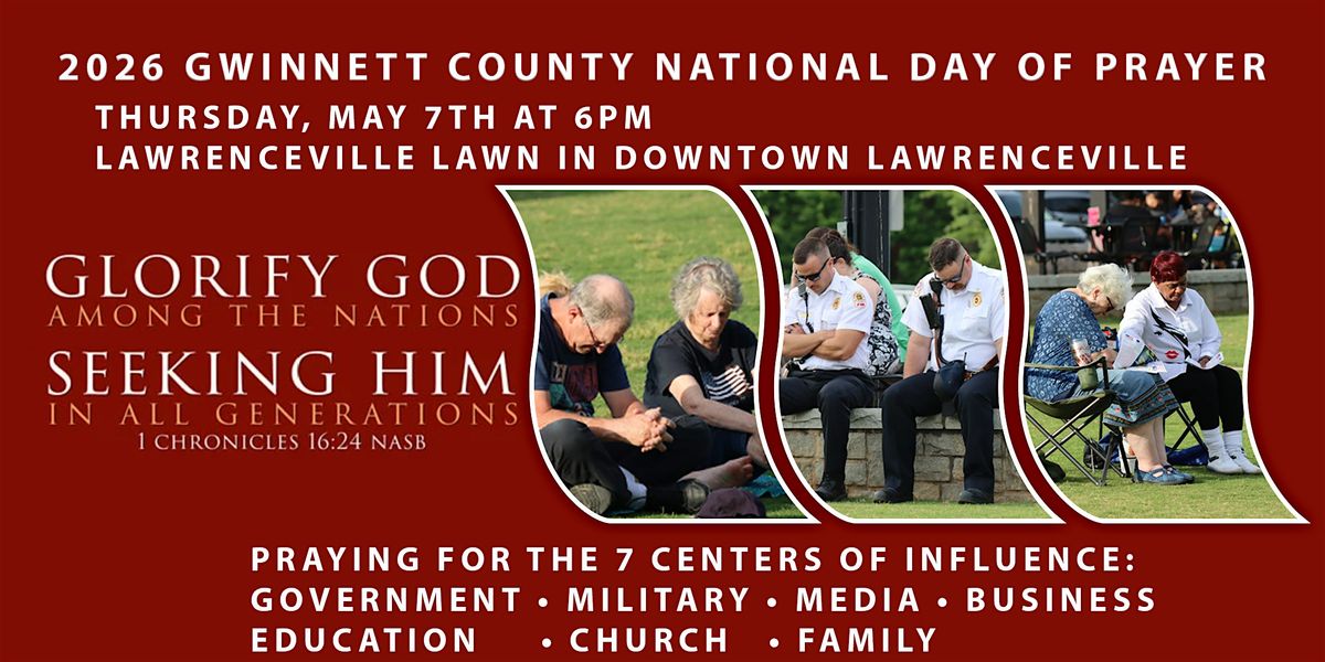 The 2025 Gwinnett County National Day of Prayer will be held onThursday, May 7, at 6:00 p.m. at the Lawrenceville Lawn (210 Luckie St, Lawrenceville). This community gathering focuses on intercessory prayer for government, education, and the church, featuring local leaders, pastors, and musical performances.
