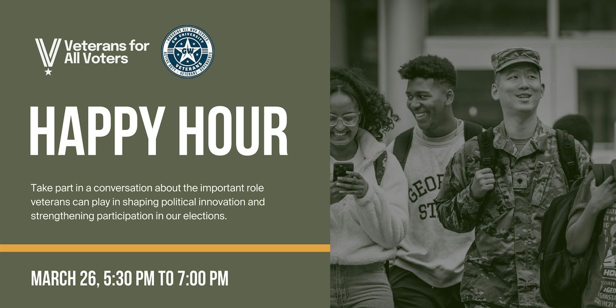 Join GWU Student Veterans and Veterans for All Voters for a casual happy hour in Foggy Bottom. Connect with fellow student veterans, build community, and take part in a conversation about the important role veterans can play in shaping political innovation and strengthening participation in our elections.