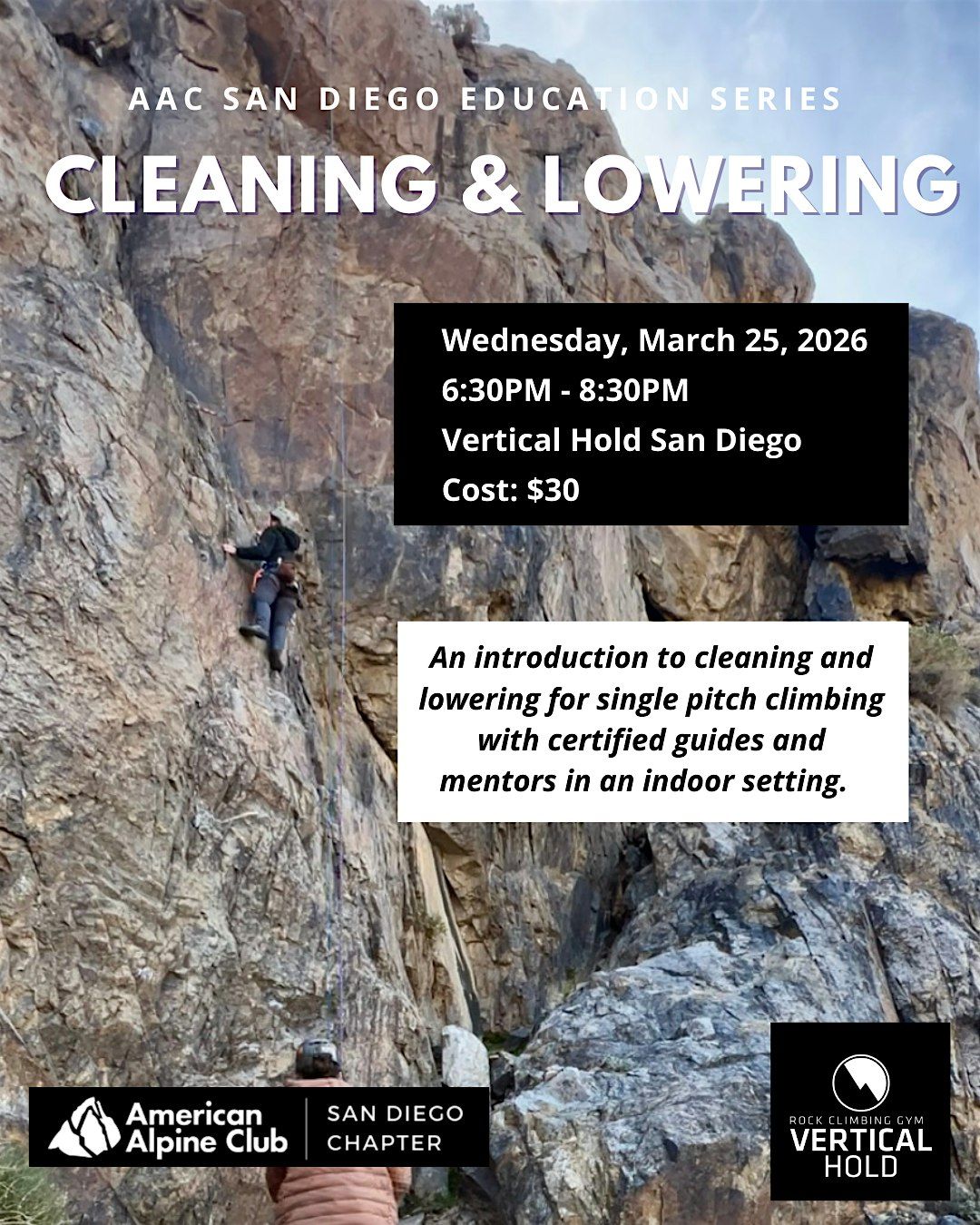 This is an introductory clinic covering the fundamental skills and systems used for cleaning routes and descending efficiently. Learn how to properly and safely clip in, retrieve your sport anchor and gear, and get lowered back down to the ground, all while staying on belay. Did you know this method is statistically safer than rappelling?