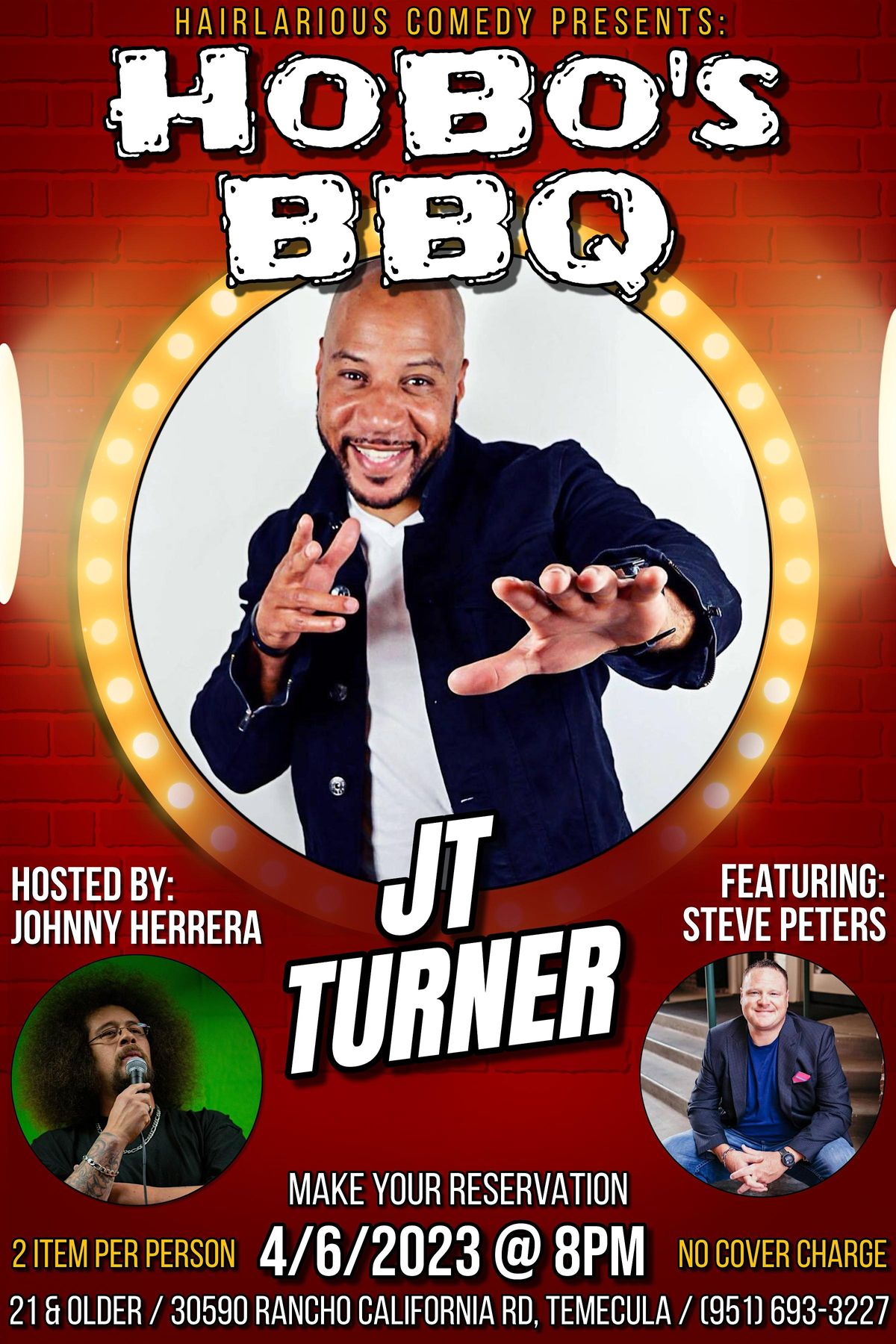 Join us on Thursday, April 6th, at HoBo's BBQ for an amazing night of comedy in Temecula! Taking the stage will be your host Johnny Herrera, Featuring Act will be Steve Peters and closing out the show will be Headliner JT Turner.
