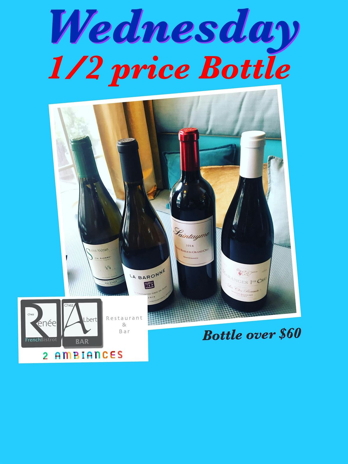 Half Price bottle Wednesday night bottle over $65