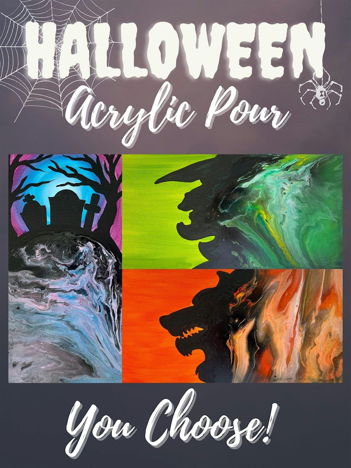 TRY SOMETHING NEW "Acrylic Pour!" We supply everything needed for your first "pour!" Choose your own colors and design! Join us in this spooktacular acrylic pour! No artistic talent needed, just the desire to have fun!