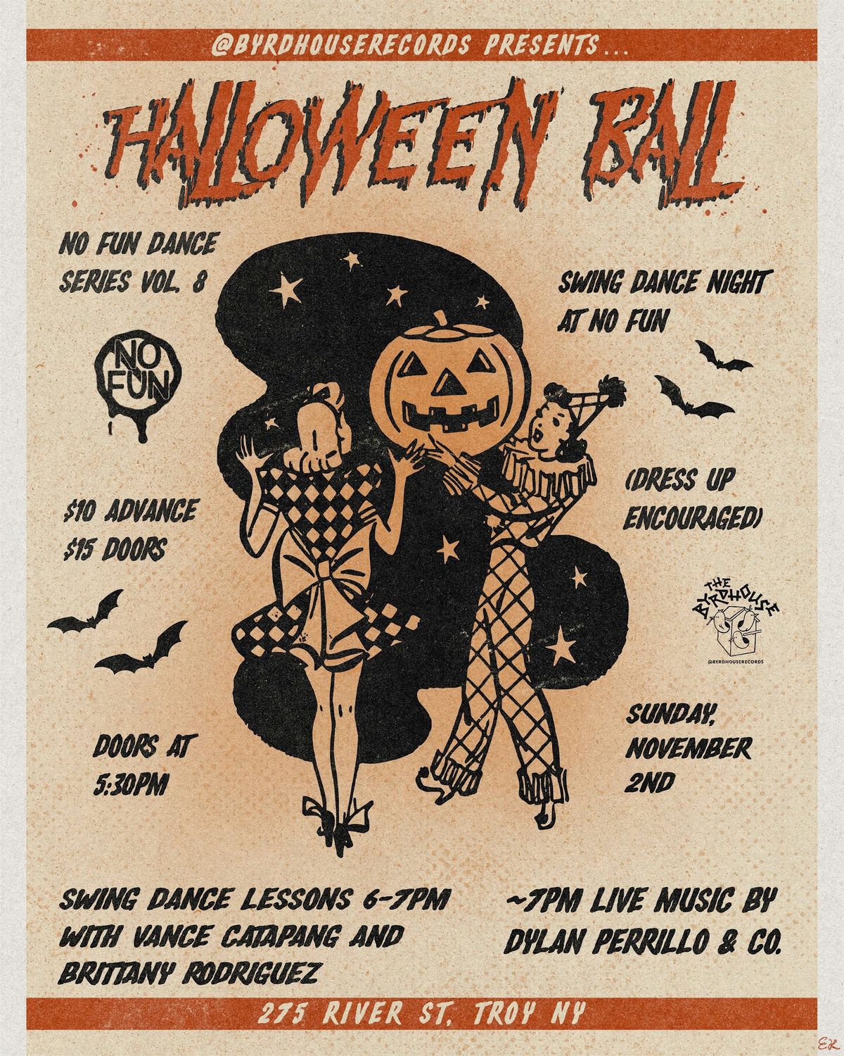Byrdhouse Records presents the Halloween Ball - No Fun Dance Series Vol. 8: Swing Dance Night featuring swing dance lessons by Vance and Brittany and live music by Dylan Perrillo and Co. on Sunday 11/2 at No Fun located at 275 River St Troy, NY!