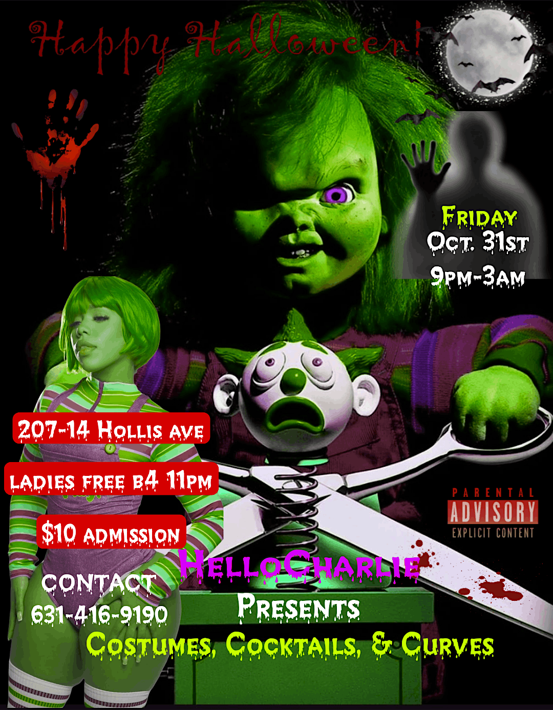 Welcome to the Costumes, Cocktails, & Curves Halloween Extravaganza! Join us for a spooktacular evening filled with fun, laughter, and of course, costumes! The event will be held at 207-14 Hollis Ave, so mark your calendars and get ready for a night to remember.