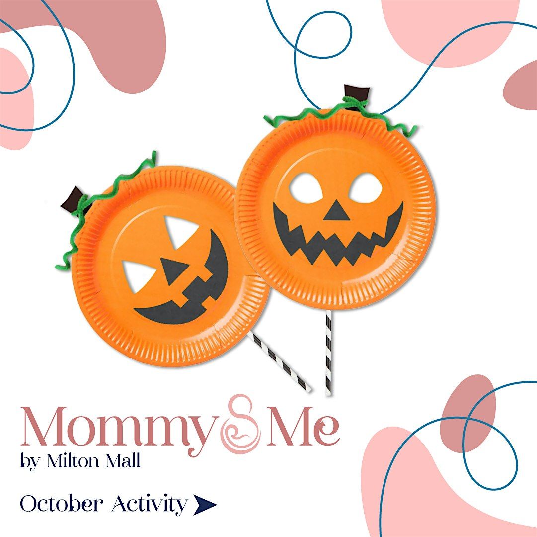 Kids create halloween pumpkin masks using paper plates, construction paper, and pipe cleaners.