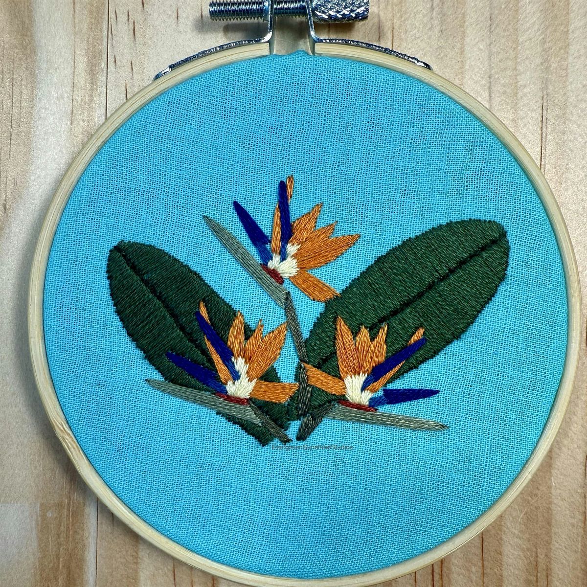 This in-person workshop will provide all the materials you need to create a beautiful embroidered bird of paradise art piece. No experience is necessary. This 2-hour workshop will provide hands-on instruction for all stitches used in the embroidery, and you will begin your piece during class. Most guests will not finish their piece by the end of the session, but you’ll leave with all supplies and instructions to complete it on your own. The full piece takes about 4-6 hours to complete for a beginner stitcher.