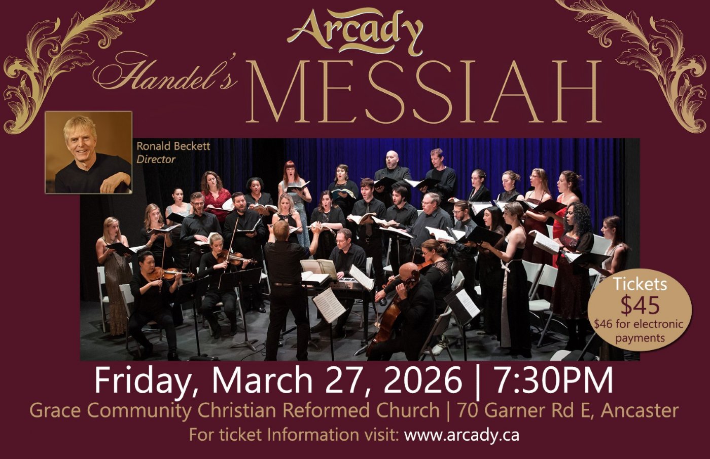 Arcady is thrilled to invite audiences to their Handel’s Messiah at Ancaster’s Grace Community Christian Reformed Church on Friday, March 27th at 7:30 PM. Experience the beloved work in Arcady’s unique Baroque style that pays homage to the original production. While often associated with the Christmas holiday, Messiah was originally intended for the Easter season and featured an intimate chamber group, a tradition now continued by Arcady. Audiences will have the chance to see Arcady’s professional chorus of soloists and chamber ensemble featuring past and present Emerging Artists. Known for his dynamic, energetic interpretation of this triumphant work, Ronald Beckett will direct his ensemble in a jubilant rendition of the timeless oratorio. Don’t miss your chance to hear the ensemble that specializes in Messiah. Audience members should secure their seats early as Arcady’s Messiah is a usually sold-out event! Tickets at $45 general ($46 for electronic payments) are available online at arcady.ca or in person at Grace Community Christian Reformed Church. For more information, please call 519-428-3185, email [email protected], or visit arcady.ca.