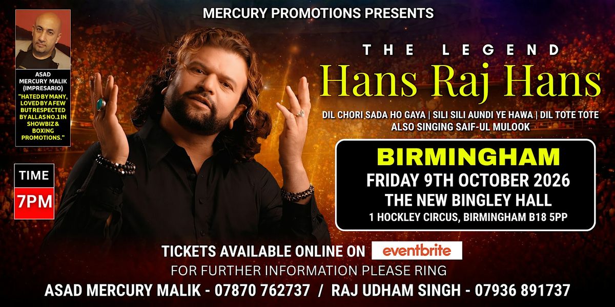 Get ready, Birmingham! Experience an unforgettable evening with Padma Shri Hans Raj Hans, the legendary voice of Punjab. One of the most celebrated and globally renowned artists in Punjabi music, he will perform his timeless hits live on stage.
