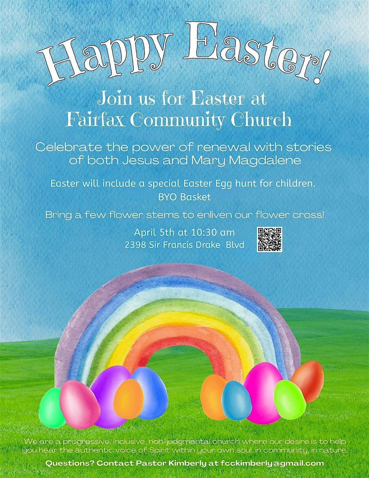 Happy Easter! Join us for Easter at Fairfax Community Church. Celebrate the power of renewal with stories of both Jesus and Mary Magdalene. Easter will include a special Easter Egg Hunt for children. BYO basket. Bring a few flower stmes to enliven our flower cross!
