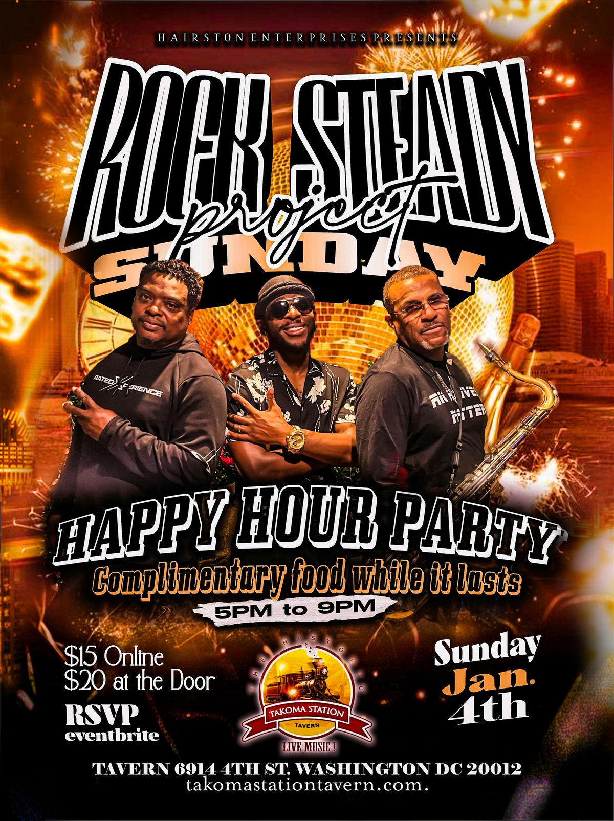 Welcome to the Happy Hour Live Performance by Rock Steady Project Band! Join us at Takoma Station Tavern on January 4, 2026 at 5:00 PM for an evening of great music and good vibes. Let's kick off the new year with some awesome tunes!