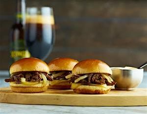 - Braised Beef Sliders: Xingu-beer braised, caramelized onions, smoked provolone, brioche bun.