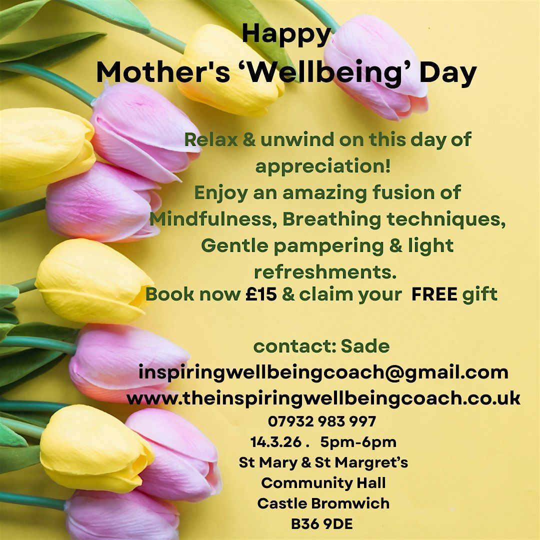 Welcome to Happy Mother's Wellbeing Day! Join us at St Mary and St Margaret's Community Hall on March 14, 2026 at 5:00 PM (Europe/London) for a day dedicated to celebrating and nurturing all the amazing mothers amd.special women out there.