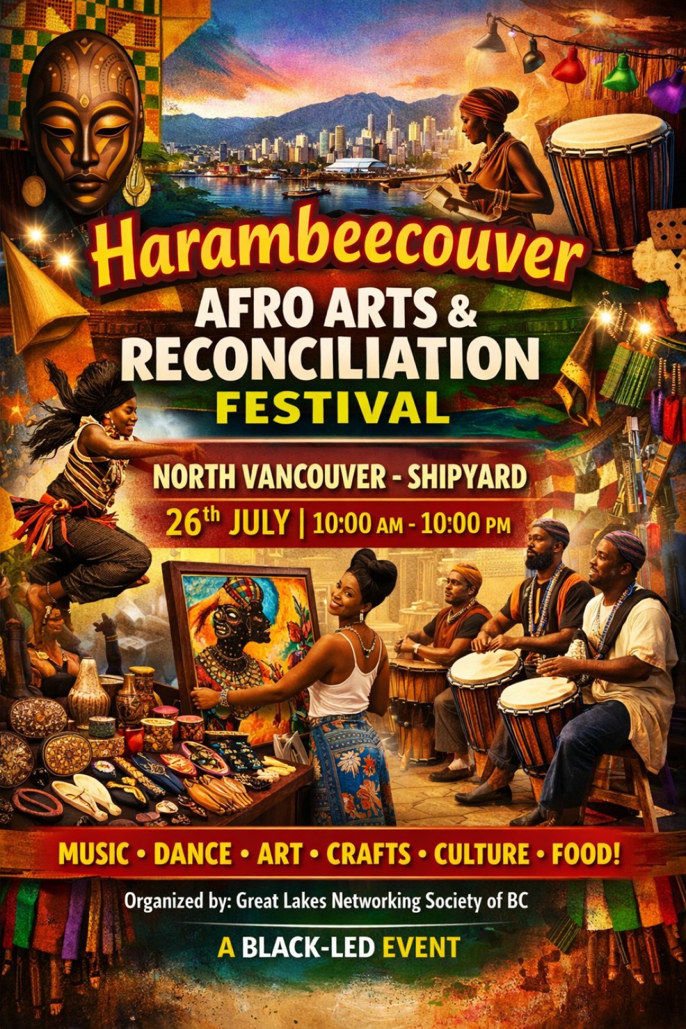 The Harambeecouver Afro Arts and Reconciliation Festival 2026 is a full-day cultural celebration, running from 9:00 AM to 10:00 PM, led by People of African Descent and rooted in community, creativity, and inclusion. The festival brings together diverse communities to celebrate African arts, culture, and heritage while promoting dialogue, understanding, and reconciliation.