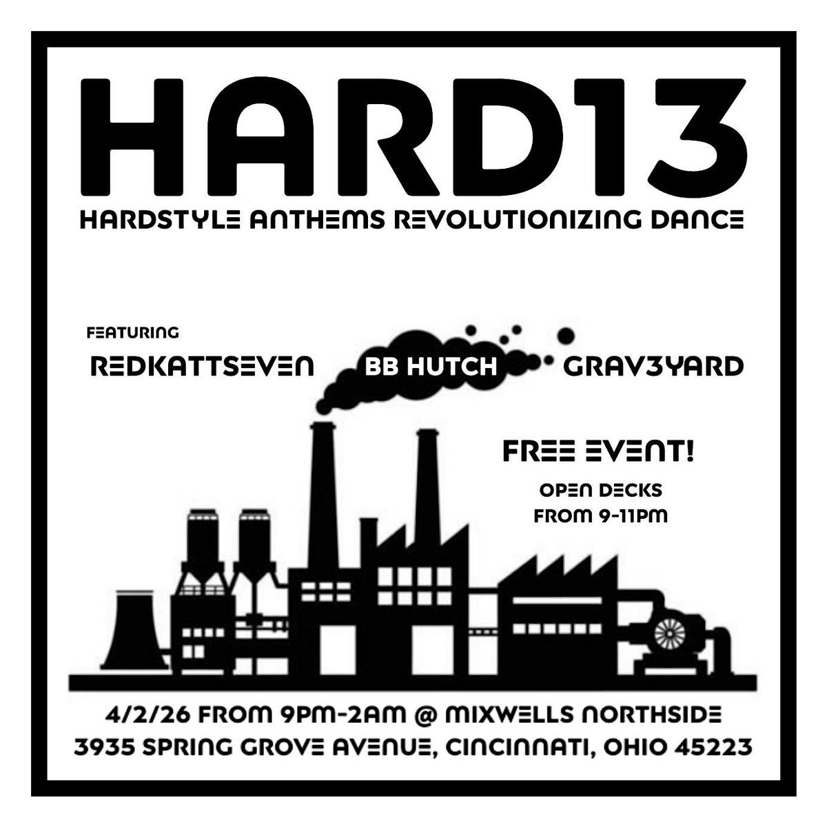 Mixwells Northside, Second Circle and Subsonic Frequencies presents H.A.R.D.: Hardstyle Anthems Revolutionizing Dance, a new monthly hardstyle, hard house and dark techno themed event on the first Thursday of each month, with a focus on those pounding 140-160 BPM techno bangers that get your blood pumping!