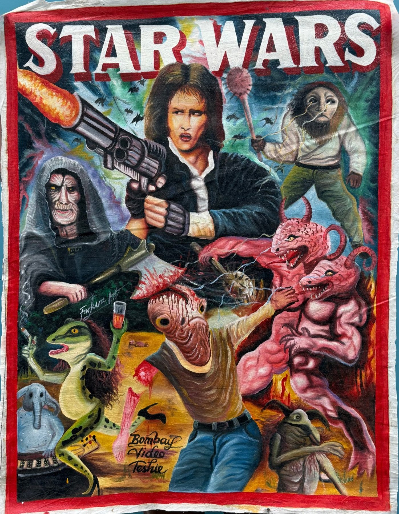This singular art form emerged in the 1980s with the rise of mobile cinemas across the country of Ghana. Originally created to advertise VHS screenings in towns and villages without proper movie theaters, these posters were painted on recycled flour sacks by local artists who freely reimagined films through bold colors, exaggerated action, and inventive (and sometimes made up) visual storytelling.