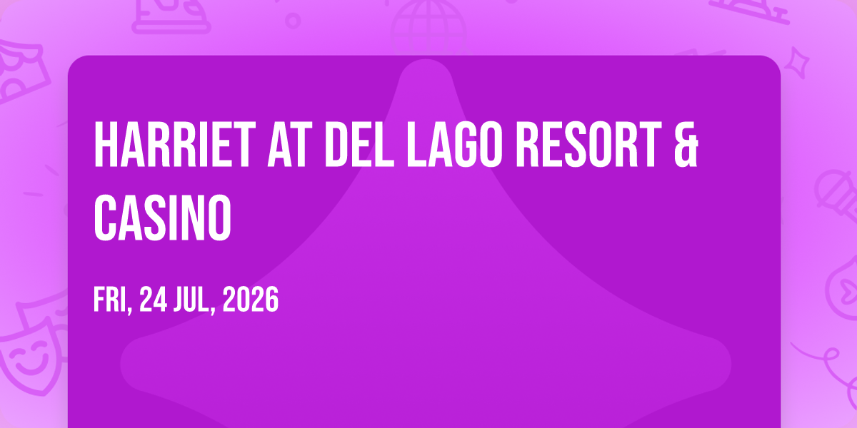π Welcome to Harriet at del Lago Resort & Casino, where the impossible becomes possible and dreams take flight! ποΈ Join us at del Lago Resort & Casino in the heart of Waterloo, NY for an event that will redefine your expectations. π On July 24th, 2026 at 08:00 PM, witness the transformation of space and time into something truly magical. β¨ It's a curated experience combining the best of innovation, entertainment, and community spirit, creating moments that will be remembered for years to come. Whether you're a first-time visitor or a seasoned enthusiast, prepare to be amazed. π Book now to ensure your place in this unforgettable experience!