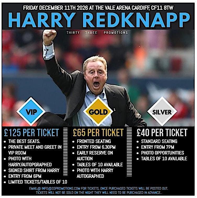 Come join us at Vale Arena Ltd on December 11, 2026 at 6:00 PM (Europe/London) for an unforgettable evening with Harry Redknapp. Get ready for an engaging and entertaining experience as Harry shares stories from his illustrious career in football and I'm a celebrity get me out of here. Don't miss out on this opportunity to meet a legend in person!