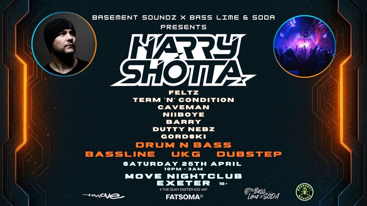 We are back again for our biggest event yet and our Exter debut. We are very proud and excited to welcome back the legendary multi award winning MC Harry Shotta to move in Exeter as our headline act plus a huge supporting lineup of djs coming from all over the UK. Expect a night full of bass heavey multi genres of music. This is going to be a huge night so grab tickets now to avoid missing out.š¶DNB - UKG - BASSLINE - DUBSTEPš¶