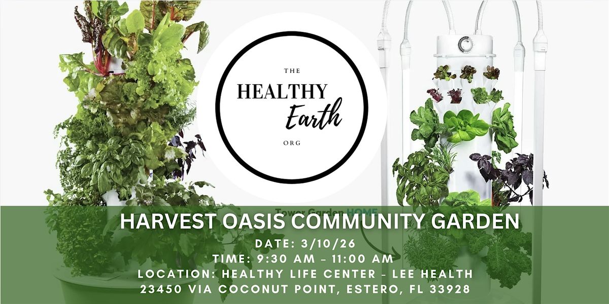 Directions: Harvest Oasis Community Garden is located at the outdoor pavilion at Lee Health - Healthy Life Center Coconut Point. Once you enter the parking lot, take an immediate right and continue to the end until you see the 4 vertical hydroponic garden.