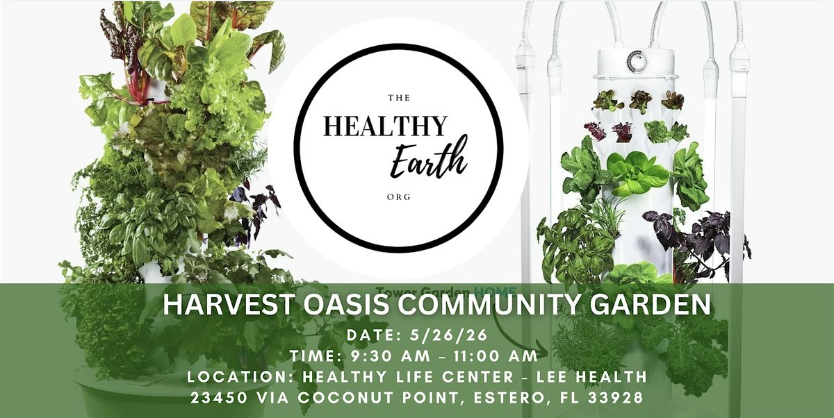 Directions: Harvest Oasis Community Garden is located at the outdoor pavilion at Lee Health - Healthy Life Center Coconut Point. Once you enter the parking lot, take an immediate right and continue to the end until you see the 4 vertical hydroponic garden.