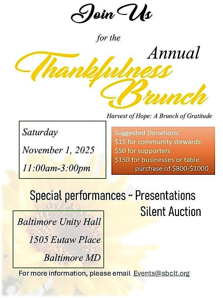 We invite you to join us for a morning of delicious food, inspiring conversation, and heartfelt gratitude at Baltimore Unity Hall. This in-person brunch is a chance to: