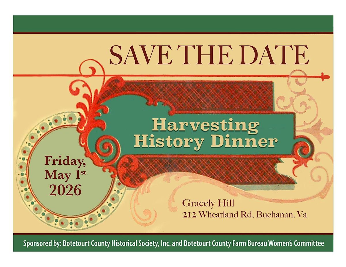 Join us at beautiful Gracely Hill in Buchanan for Harvesting History, a special fundraiser and kickoff for our upcoming Botetourt agriculture exhibit, presented in partnership with the Botetourt County Farm Bureau Women's Committee.