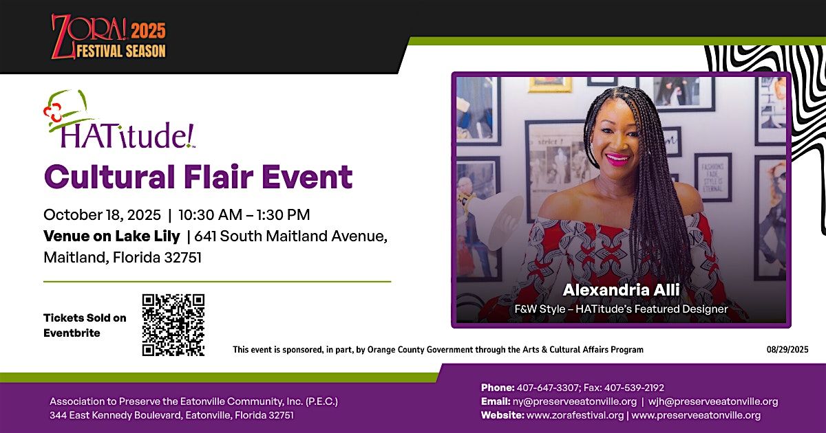 The HATitude! Cultural Flair Event is one of the most highly anticipated fashion-infused cultural events in the Southeast, returning as a highlight of the 2025 Zora Neale Hurston® Festival of the Arts and Humanities Season. This stylish gathering blends high fashion, cultural pride, and community impact—all while supporting the work of the Association to Preserve the Eatonville Community, Inc. (P.E.C.).