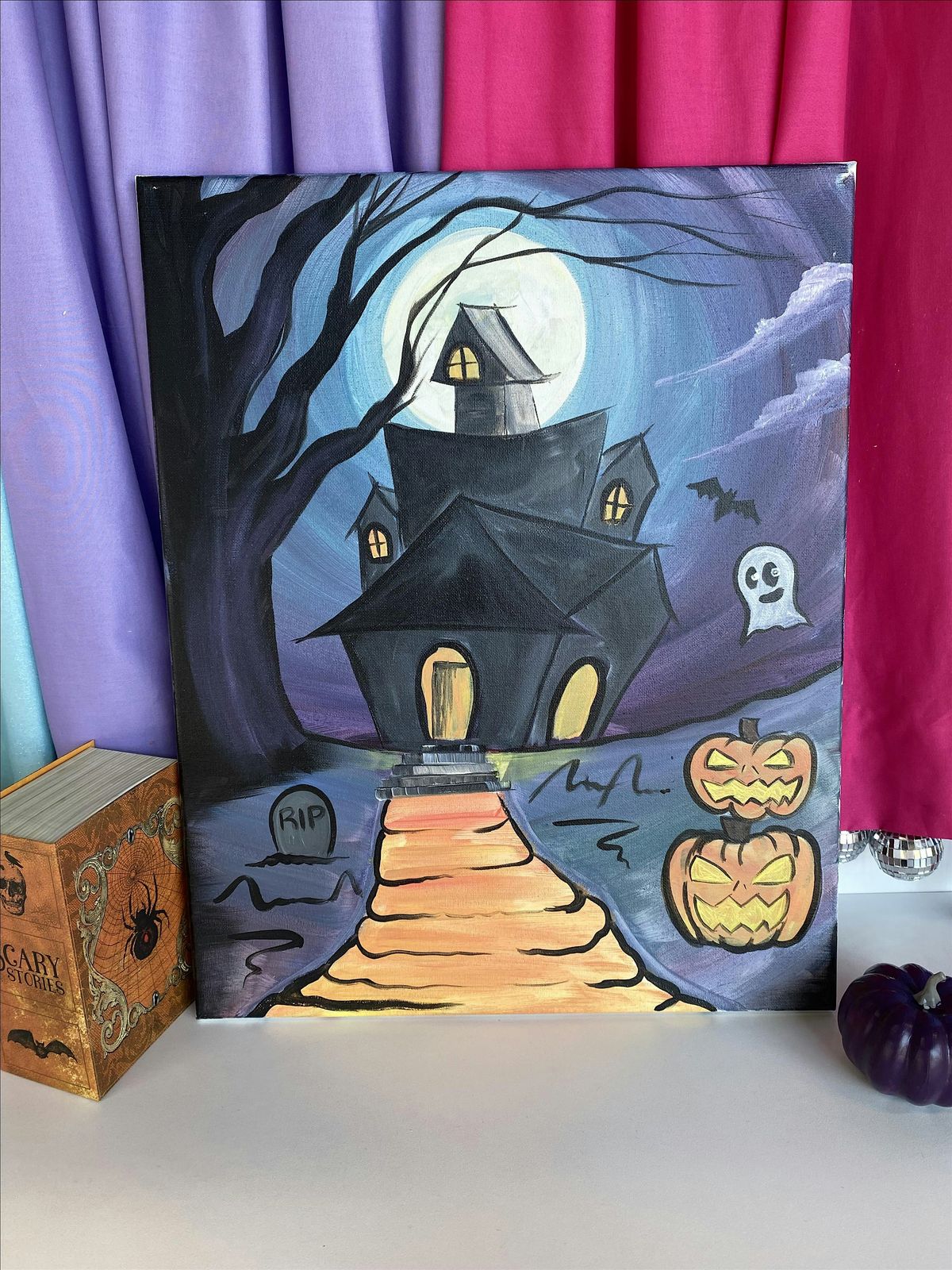 Bring the whole family for a frightfully fun evening of creativity! Our friendly instructor will guide you step-by-step as you paint a glowing night scene with a spooky haunted house, playful ghost, grinning pumpkins, and a bright moon overhead.