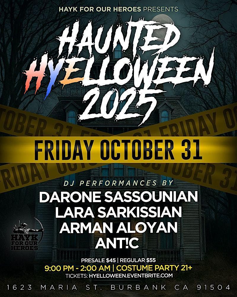 Step into the ultimate Halloween experience at Haunted Hyelloween 2025 . Join us on Friday, October 31st in Burbank for an unforgettable night filled with music, costumes, and spooky vibes. This 21+ costume party will feature live DJ performances by Darone Sassounian, Lara Sarkissian, Arman Aloyan, and ANT!C, keeping the energy high all night long.