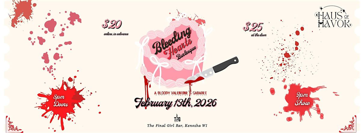 Welcome to Haus of Havok Presents: Bleeding Hearts Burlesque at The Final Girl! We're back again and we're coming armed with Cupid's arrows on only one of the best Fridays of the year. Feeling lucky, my love? Get ready for a night of sultry performances and captivating acts on Friday, February 13, 2026 at 9:00 PM (Central Time — no need to worry about Jason. He's in Jersey.). Join us for a thrilling evening filled with mesmerizing burlesque routines all celebrating twisted and horrific love (our favorite kind) that will leave you wanting more. Ditch the chocolate and rom coms, grab a drink and your dollar bills, and come out for a night of sexy, sensual sinning with our burlesque beauties!