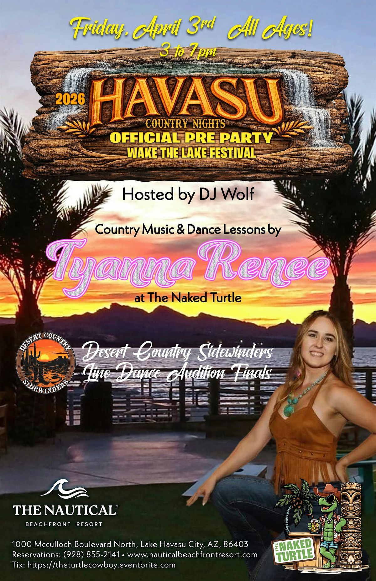 Come out April 3 to the Nautical Beachfront Resort @ The Naked Turtle for Havasu Country Nights and Wake the Lake Festival preparty featuring Tyanna Renee and Dj Wolf. This event will be the audition finals to join the Desert Country Sidewinders (line dance Team) and win a chance to dance live at Wake the Lake Country Festival held at Lake Havasu State Park.