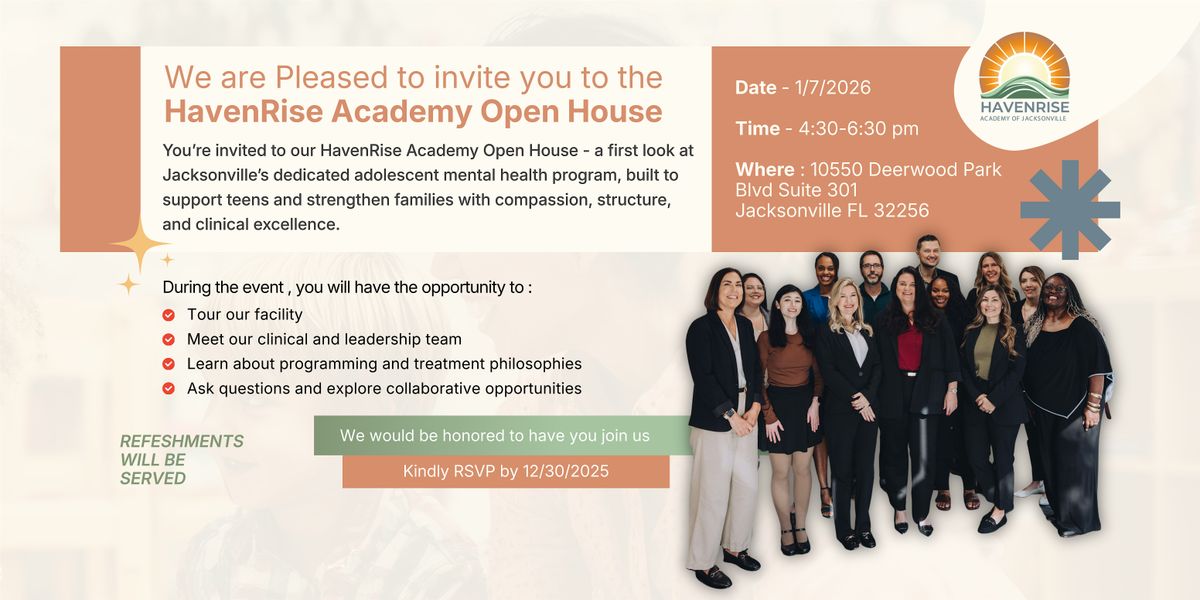 HavenRise Academy is officially open, and we invite you to join us for an inside look at Jacksonville’s newest adolescent-only mental health program. At this open house, you’ll meet our team, tour our treatment spaces, and learn how our structured, trauma-informed programs support teens navigating anxiety, school stress, emotional challenges, and more.
