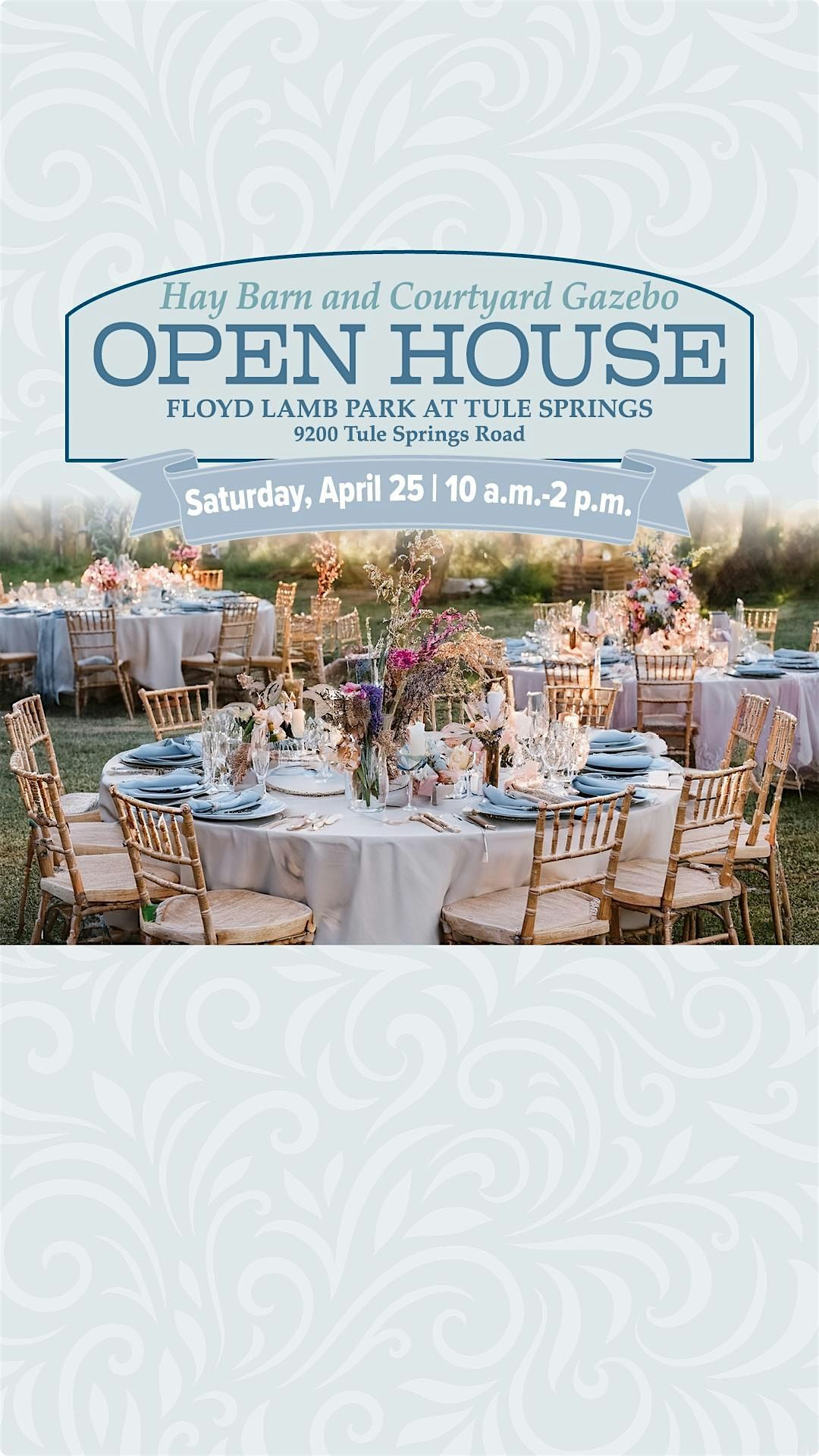 Explore a one-of-a-kind outdoor venue at Floyd Lamb Park at Tule Springs during this special open house designed with event planners in mind. Tour the newly renovated hay barn and courtyard gazebo, experience the layout firsthand and envision how the space can transform for weddings, gatherings and private events.