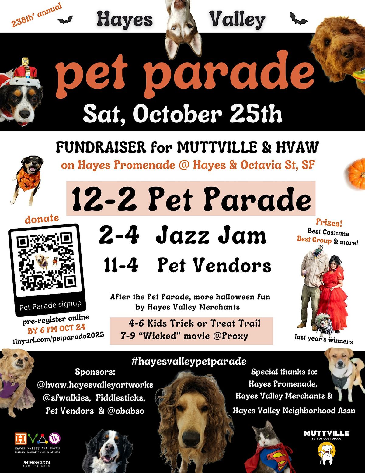 Produced by Hayes Valley Art Walks and @SFWalkies, in association with @obabso and @thegateguysf. Sponsored by pet vendors and Fiddlesticks. Special thanks to Hayes Valley Merchants, Hayes Valley Neighborhood Association, and Hayes Promenade. Benefiting @muttvillesf — share photos with #hayesvalleypetparade.