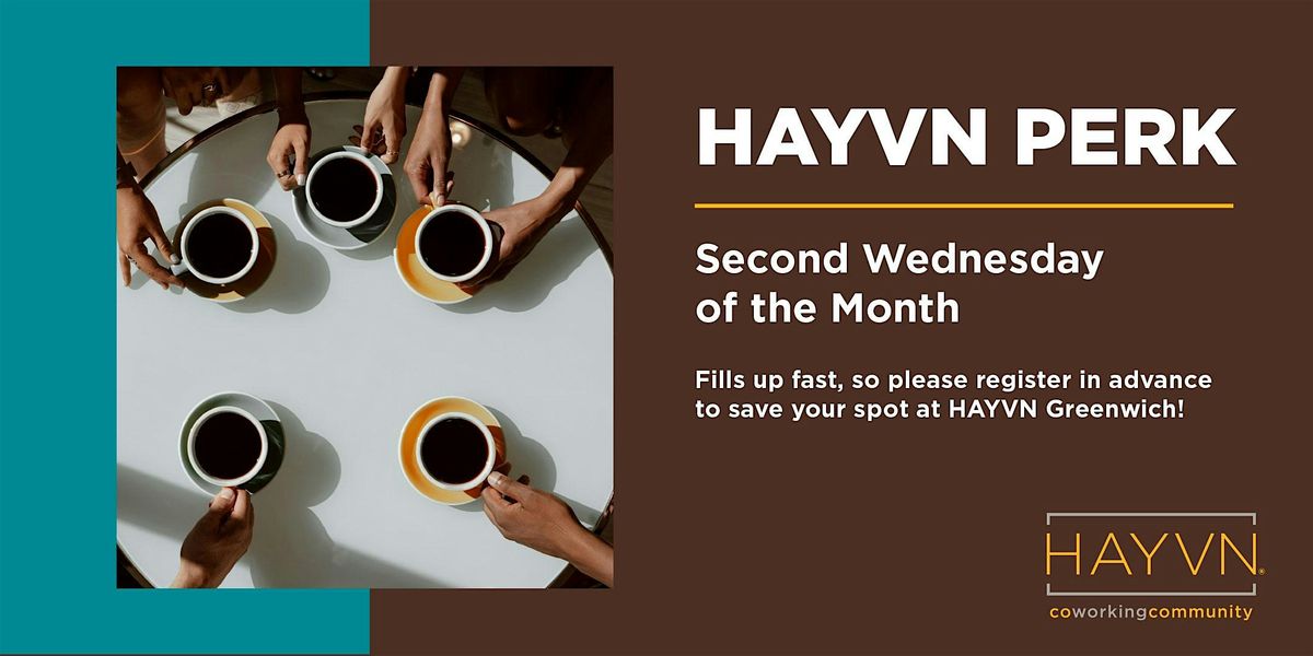 Fuel your morning with fresh coffee and fresh connections at HAYVN Perk, a laid-back networking series at HAYVN in Greenwich, CT. Whether you’re looking to spark new collaborations, exchange ideas, or just enjoy a great cup of coffee with like-minded professionals, this is the perfect way to start your day. No pressure, just good vibes, great people, and caffeine-fueled conversations!