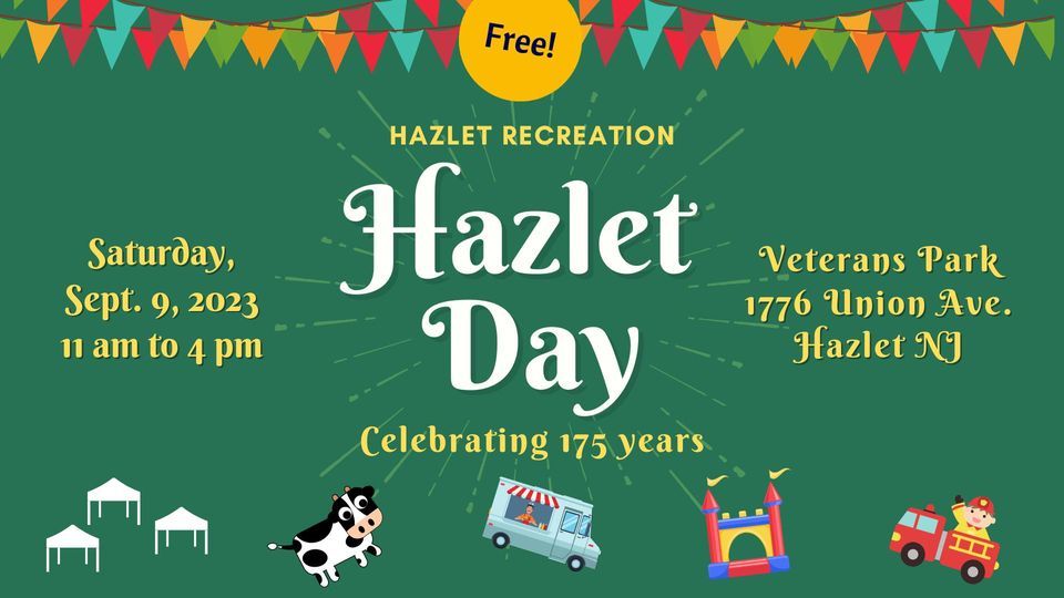 Hazlet Day on Saturday, Sept. 9, 2023, It is our town celebration, a free outdoor family-friendly festival with neighbors. This year we are celebrating our 175th Anniversary! The festival includes bouncy inflatables, a petting zoo, carnival games, face painting and lots of fun kids activities. Come hungry for more than a dozen food trucks selling a variety of fare.
