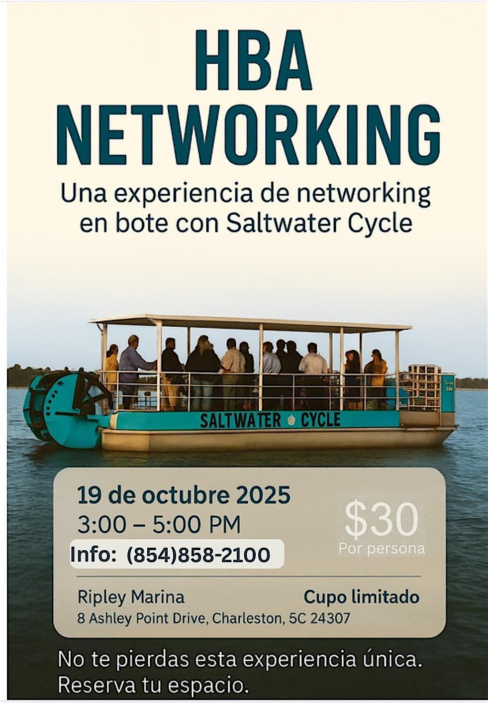 Únete a Hispanic Business Association para una tarde diferente de conexión y diversión en un recorrido en bote con Saltwater Cycle.