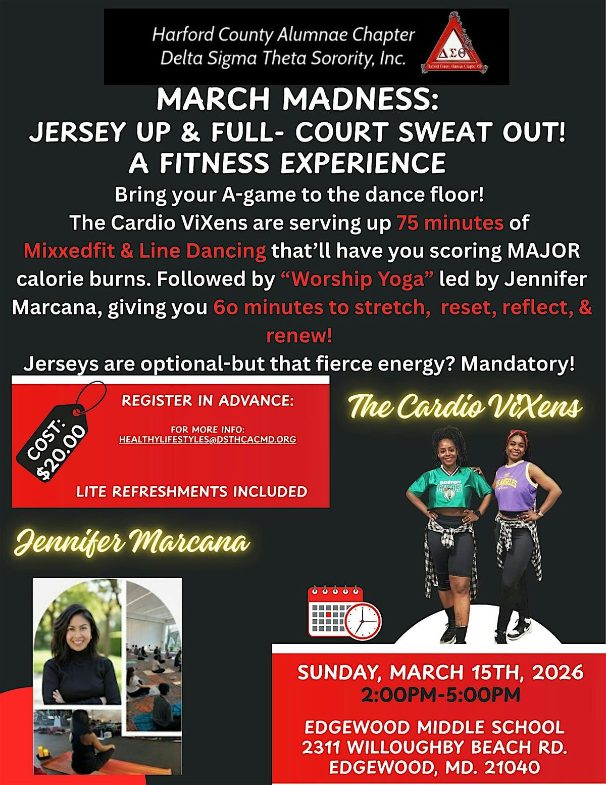 March Madness: Jersey Up & Full Court Sweat Out! 75 minutes of MixxedFit & Line Dancing followed by Worship Yoga giving you 60 minutes to stretch, reset, reflect and renew. Lite refreshements are included. For questions: [email protected]