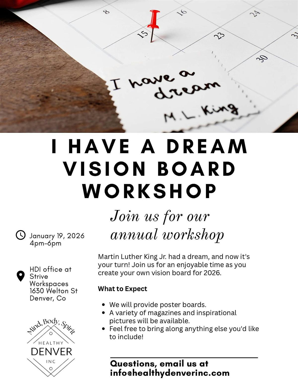 Ready to bring your dreams to life? Join us in person for the HDi Annual I Have a Dream Vision Board Workshop! It’s a fun, creative way to map out your goals and get inspired. Whether you’re a dreamer or a doer, come craft your vision board surrounded by great vibes and positive energy. Let’s make those dreams visible and REAL!