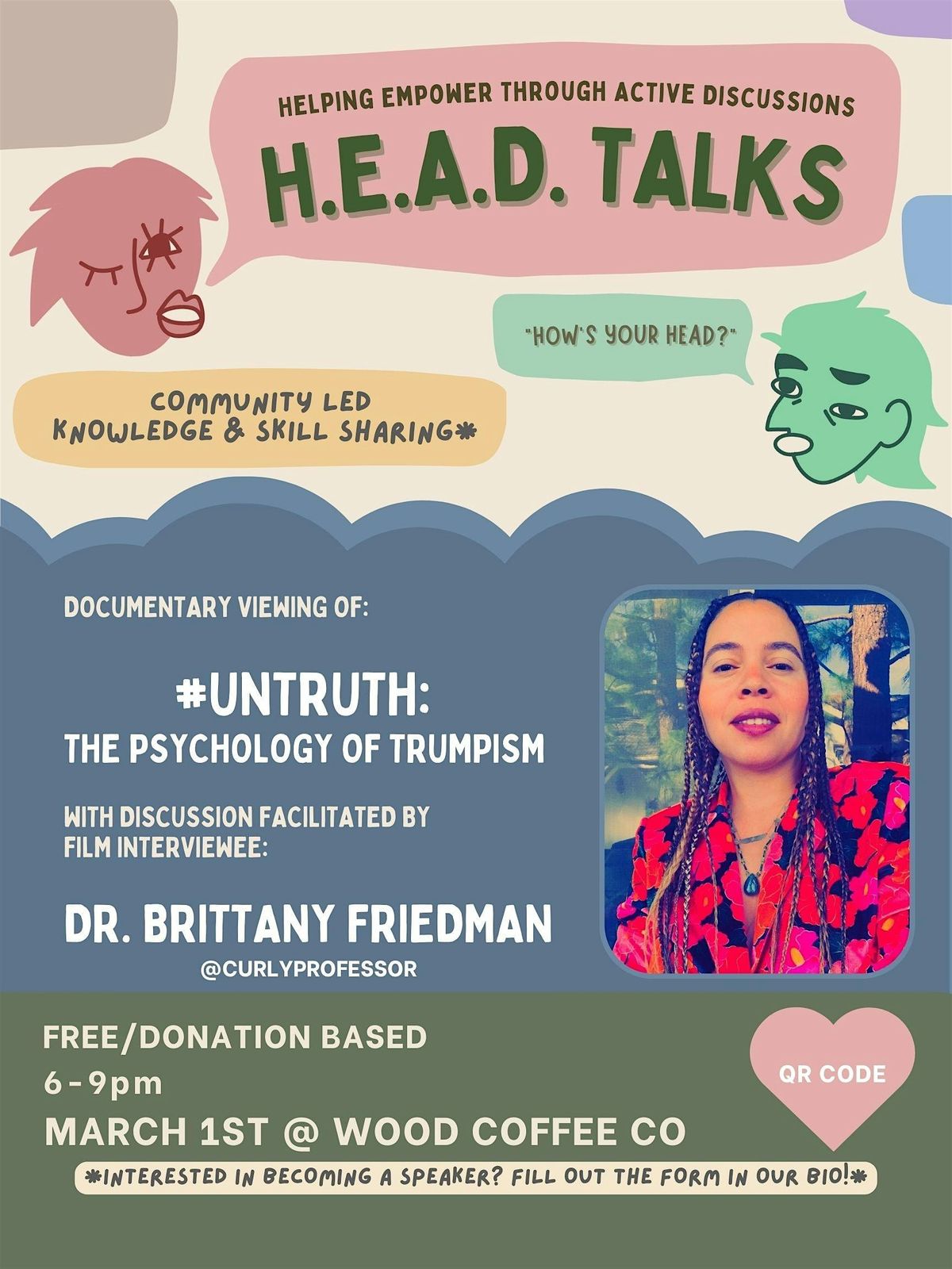 What is head? Helping empower (through) active discussion. The goal is as simple as it is broad - to open up our space to share important information on a variety of topics from social justice, LGBTQIA+ rights, climate crisis, local organizing, native land and more through community. These events will always remain free with an option to donate to keep the series going - donations will go to supplies needed for small costs (print outs, take away materials, etc.) with any remaining funds going to an organization of the speakers choice.