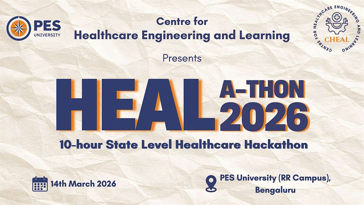 Get ready for an exciting in-person Hackathon hosted by the Centre for Healthcare Engineering and Learning (cHEAL) at PES University Bangalore. Dive into innovative healthcare solutions, collaborate with like-minded folks, and boost your skills in a fun, energetic atmosphere. Don't miss out on this chance to connect, learn, and make an impact in healthcare engineering. Register through eventbrite and fill this form