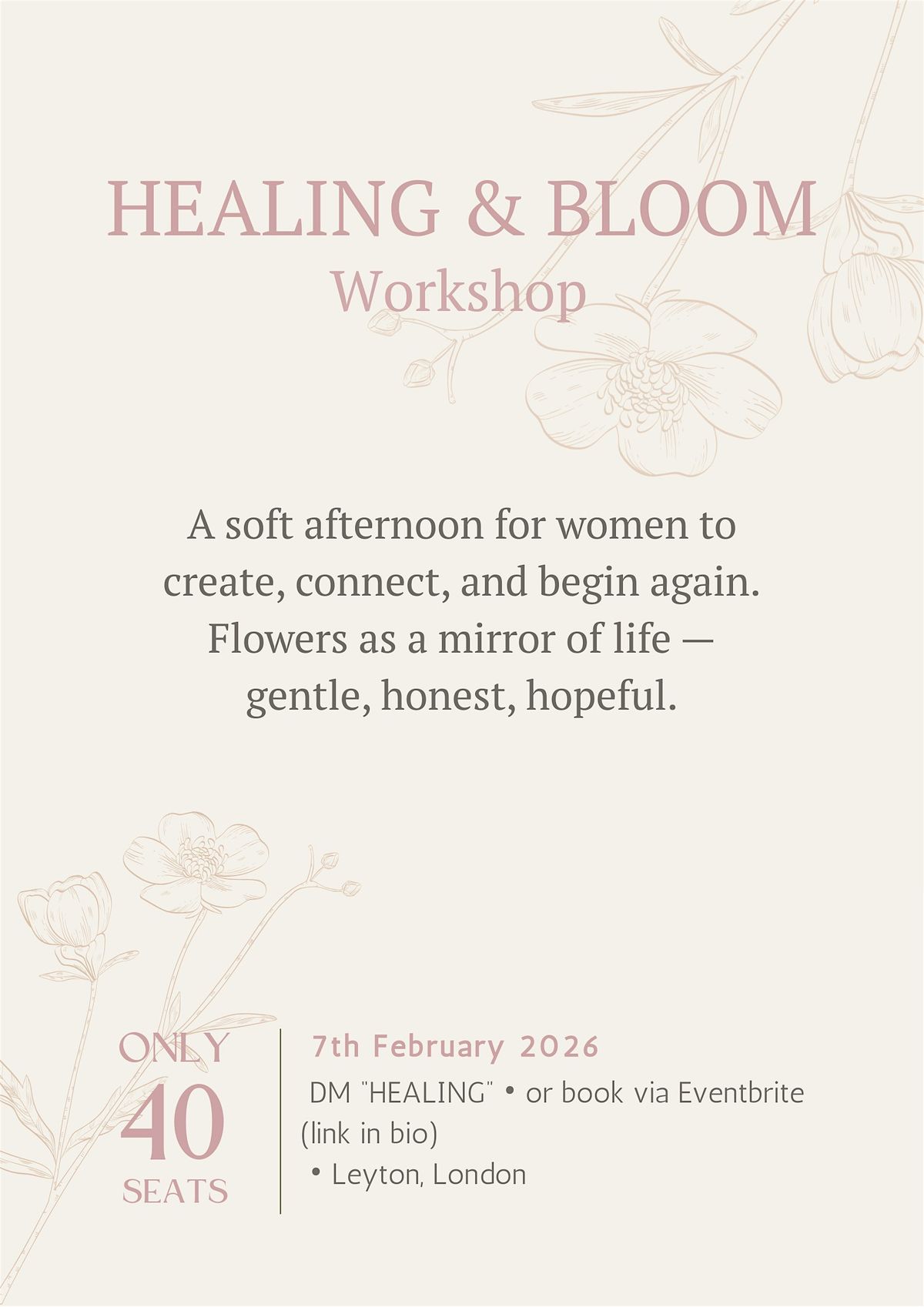 Join us for a fun and relaxing in-person floral workshop! Dive into the world of blooms and discover how flowers can bring healing and joy to your life. Perfect for anyone looking to unwind, get creative, and connect with nature. No experience needed—just bring your smile and let's make something beautiful together!